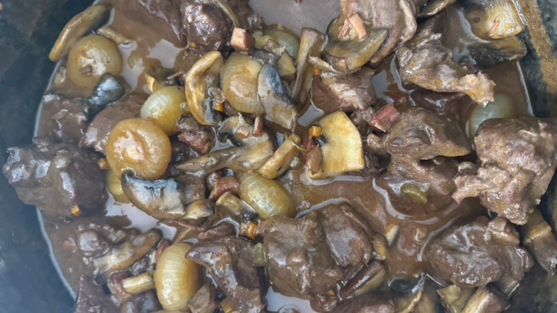 Rimettiamo il manzo e la pancetta nella pentola in ghisa, aggiungiamo le cipolle e i funghi champignon, e quando la salsa avrà raggiunto la densità desiderata, la verseremo sopra la carne.