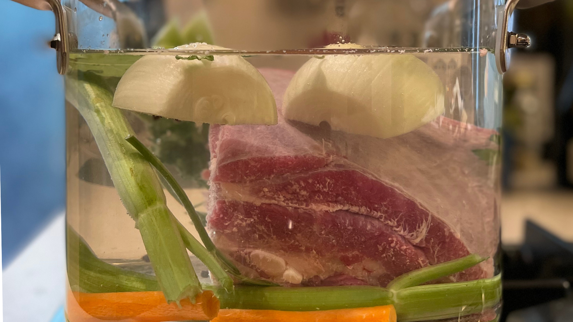 Mettiamo tutti gli ingredienti dentro una pentola capiente e riempiamo di acqua – a freddo mi raccomando. Accendiamo il fuoco e quando il brodo comincia a sobbollire abbassiamo la fiamma e lasciamo andare per almeno due ore.