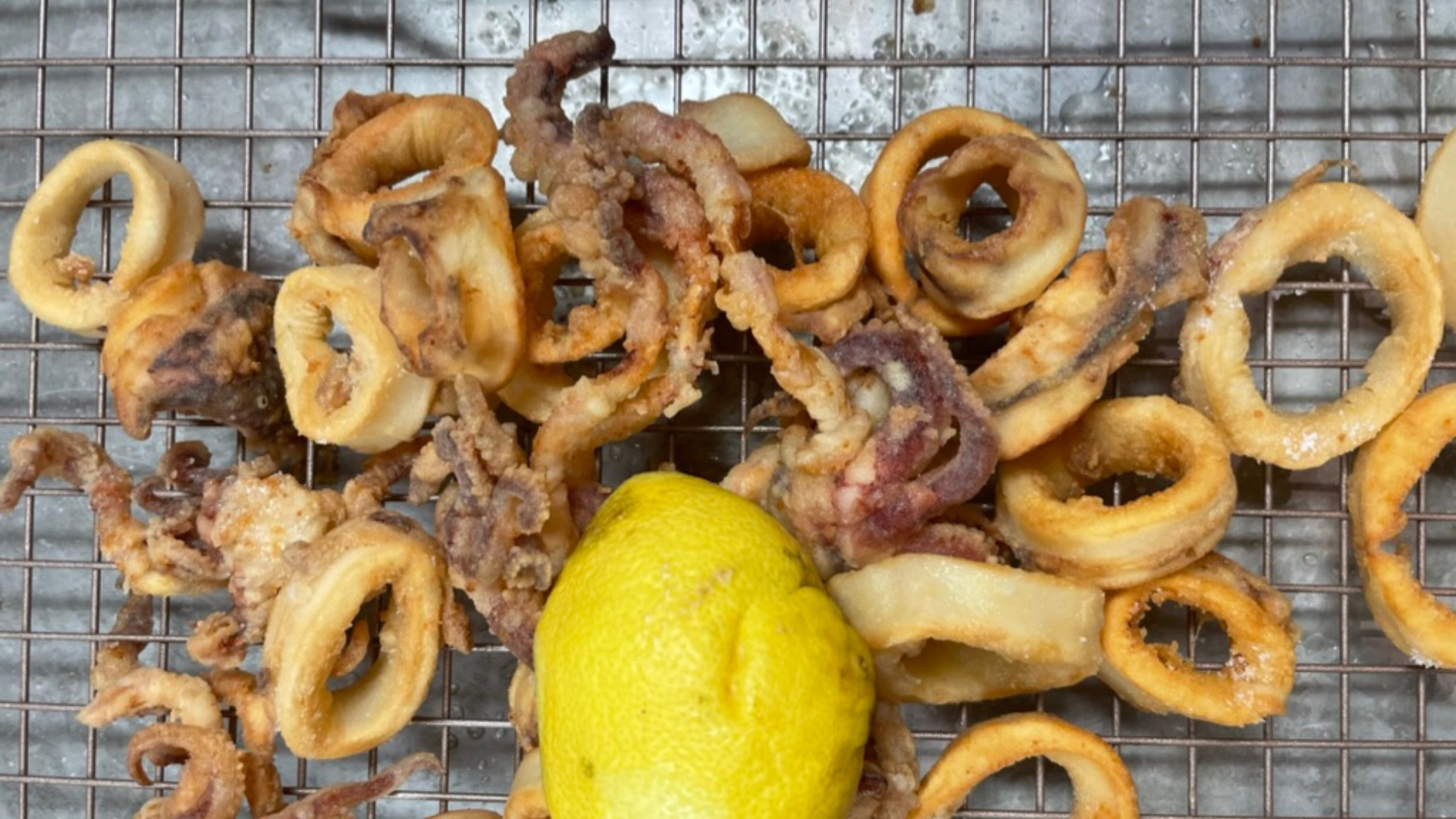 Dopo che avremo scolato la prima parte dei calamari mettiamoli a riposare su una griglia, aspettiamo che l’olio torni in temperatura e immergiamo con attenzione gli altri calamari.