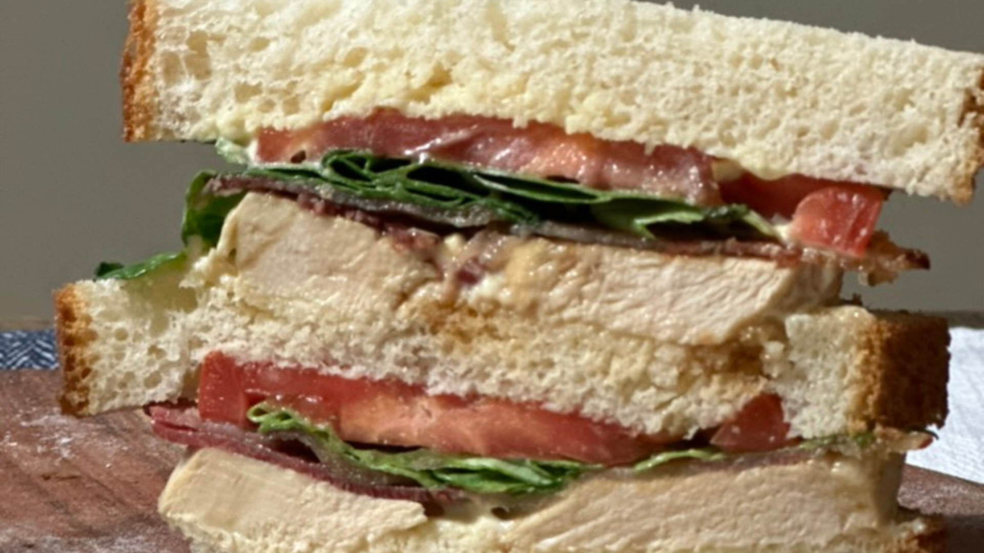 Adesso possiamo comporre il sandwich: nella fetta alla base spalmiamo un cucchiaino di maionese, aggiungiamo due fette di pollo e una fetta di pancetta croccante. Aggiungiamo la lattuga, una fetta di pomodoro e un po’ di sale.