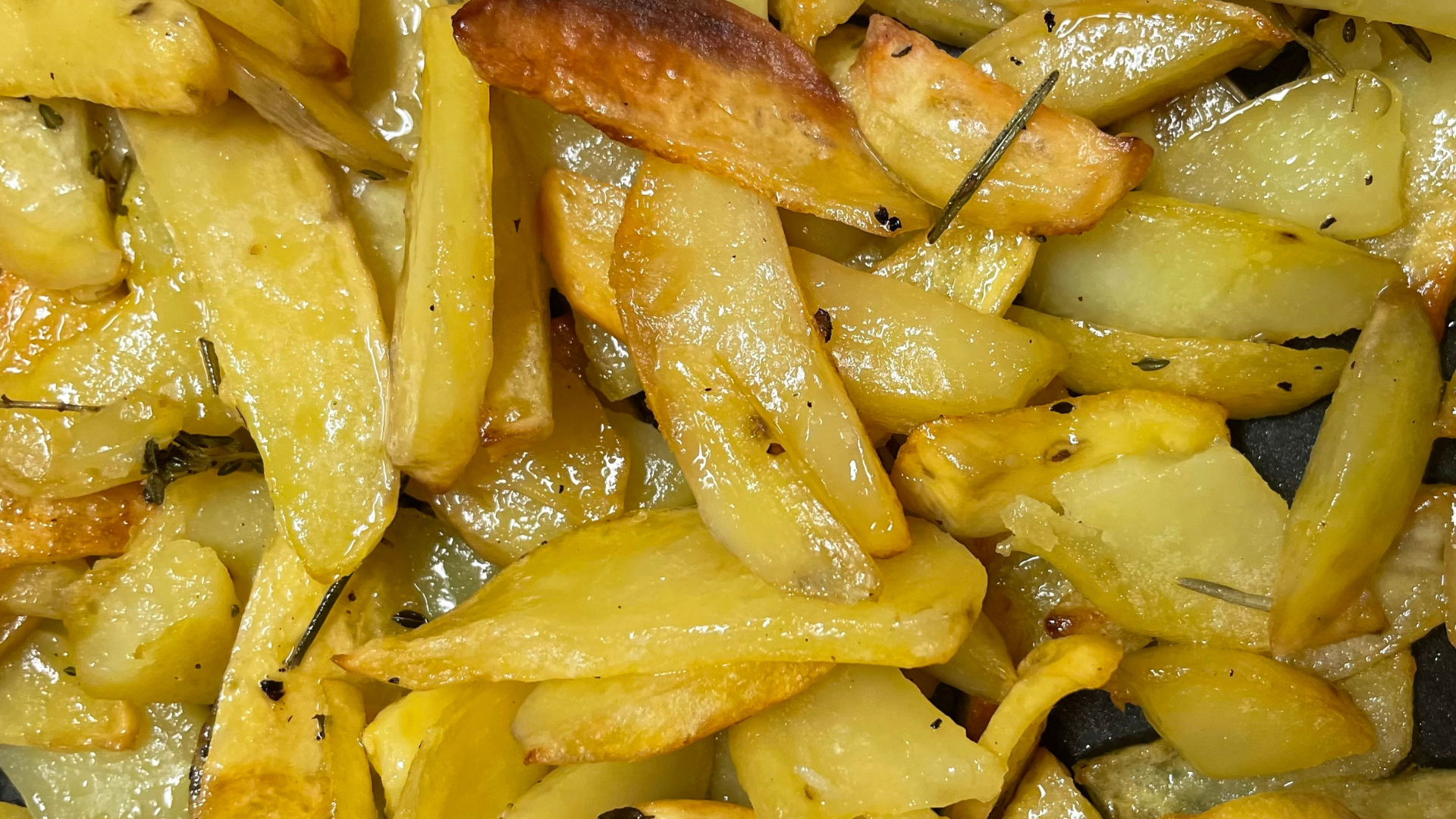 Accendiamo il forno a 180°, nel frattempo asciughiamo bene le patate e poi, in un ampio contenitore, condiamo le patate con olio di oliva (non extravergine), sale kosher, gli spicchi di aglio leggermente schiacciati, timo, rosmarino e una spolverata di pepe.