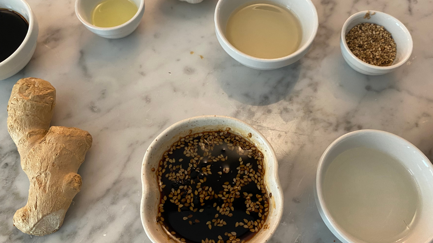 Dopo 10 minuti filtriamo la salsa e aggiungiamo l’olio di sesamo e i semi di sesamo e mescoliamo.