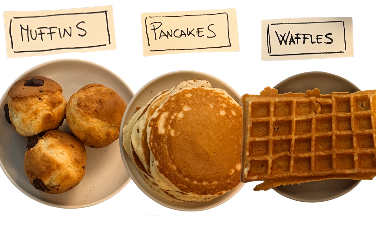 Con gli stessi ingredienti puoi creare tre dolci completamente diversi: muffins, pancakes e waffles nascono dallo stesso impasto, ma cambiano equilibrio e consistenza. Proporzioni, tecnica e cottura trasformano una base in tre strutture uniche. Perché in cucina non contano solo le ricette, ma come le fai.