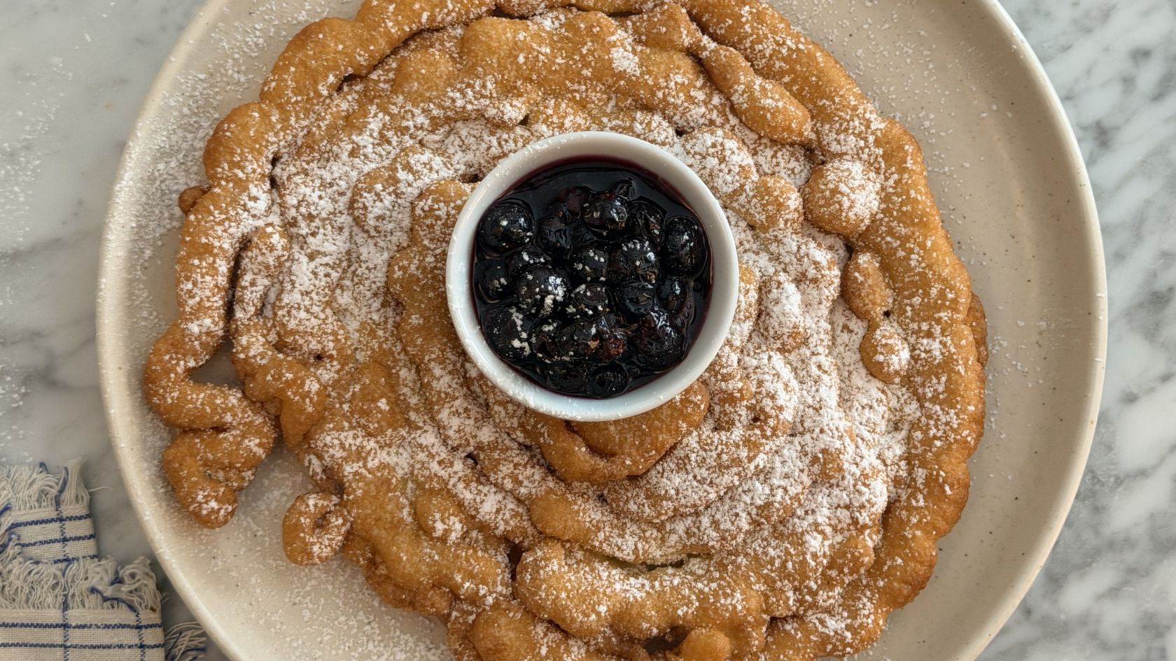 Quando sarà pronto da entrambi i lati lo scoliamo su carta assorbente e poi lo mettiamo su un piatto: servirà una generosissima dose di zucchero a velo e poi, in mezzo, mettiamo una ciotolina con la composta di mirtilli rossi, che avremo preparato scaldando in un pentolino per dieci minuti i mirtilli, lo zucchero e un paio di cucchiai d’acqua.