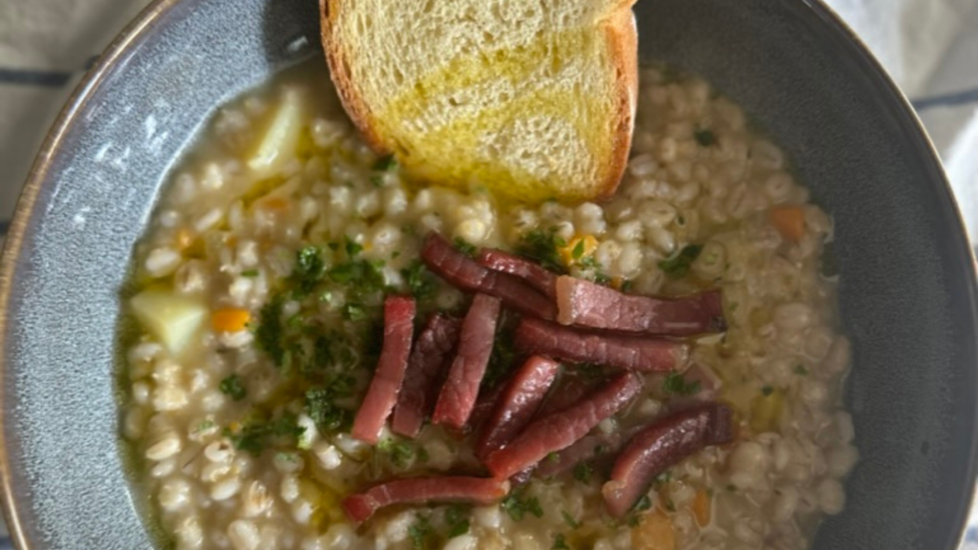 Controlliamo sempre i tempi di cottura sulla scatola (per questo orzo ci vorranno 30-40 minuti) e se la zuppa si asciuga troppo aggiungiamo del brodo o anche semplicemente dell’acqua calda. A metà cottura aggiungiamo anche metà dello speck tagliato a listarelle, mentre l’altra metà la rosoliamo in una padella antiaderente per dare una nota di croccantezza al piatto al momento dell’impiattamento.